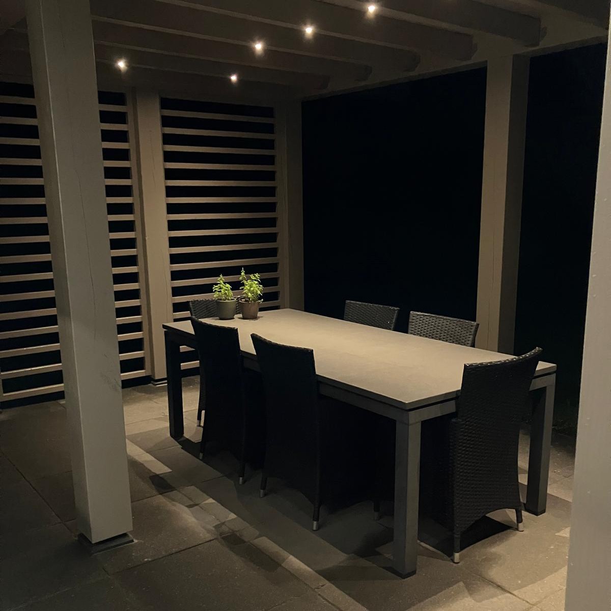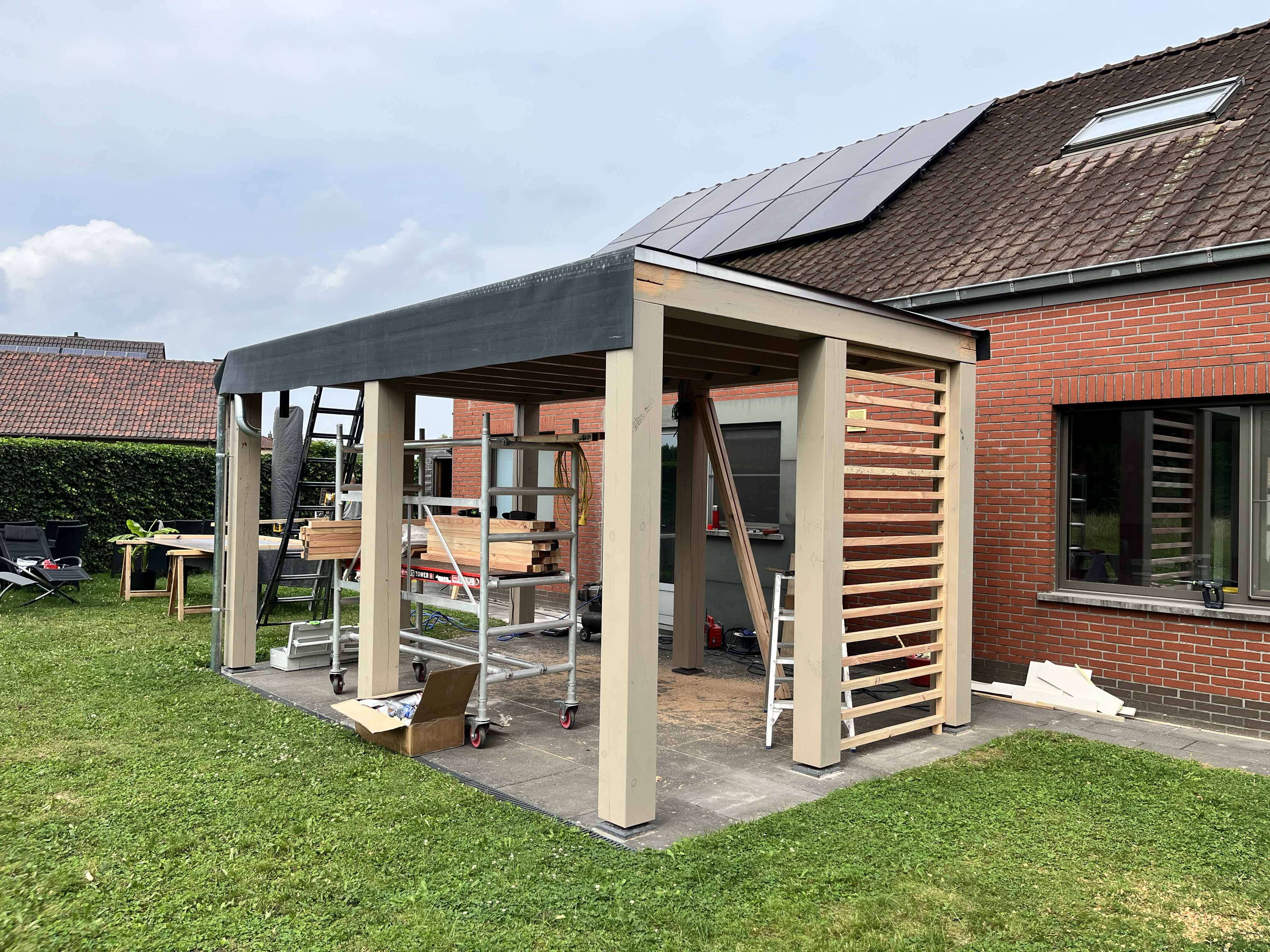 Bij An en Jan realiseerden we een stijlvolle overkapping van het terras die naadloos aansluit bij de woning en de tuin. De constructie werd volledig in hout uitgevoerd en afgewerkt met een duurzaam EPDM-dak. Dankzij de geïntegreerde verlichting kan het terras op elk moment van de dag en in elk seizoen gebruikt worden. Het resultaat is een warme, gezellige buitenruimte die comfort en esthetiek perfect combineert en het buitenleven van An en Jan aanzienlijk verbetert.